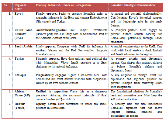 · Intensify diplomacy to maintain the unified front of the African Union, Arab League, and Organization of Islamic Cooperation . The goal is to transform political condemnation into concrete actions, such as discouraging member states from any engagement with Somaliland that implies recognition.